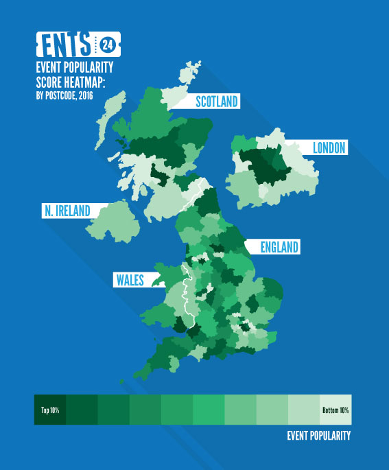 - The Event Popularity Score was determined by dividing the number of event 'tracks' within a postcode area by the number of people living there. Postcodes were then ranked by Event Popularity Score and split into percentiles to create the heat map.